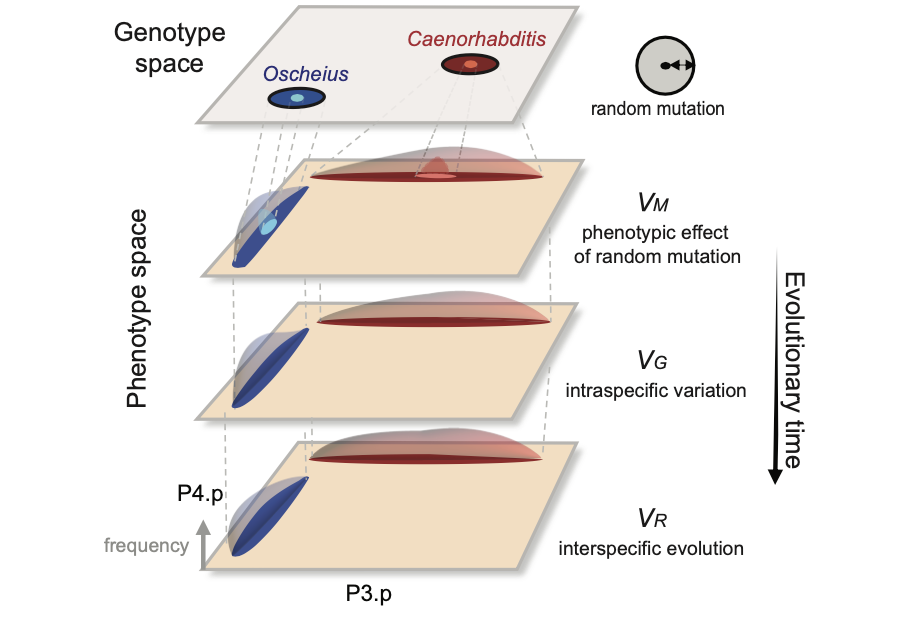 A major contribution concerns the evolutionary effect of the genotype-phenotype relationship: while mutations affect genes at random, they do not necessarily affect phenotypes at random. Using mutation accumulation lines started in different wild genetic backgrounds, the team measured the capacity to evolve (=mutational variance, evolvability) of the fates of the different vulval precursor cells. This evolvability itself evolves and corresponds to evolutionary trends observed across different genera and species.