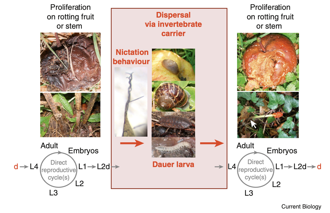 They discovered populations of C. elegans growing in decaying plant matter (fruits, flowers, stems). Identifying this habitat enabled the discovery of many variants of C. elegans and new species of the same genus, which have become the basis for diverse studies, particularly on speciation. Demographic data define a life cycle in nature for this model organism: C. elegans proliferates rapidly for several generations in a substrate, then migrates in a diapause stage to a new substrate, partly via vector animals.