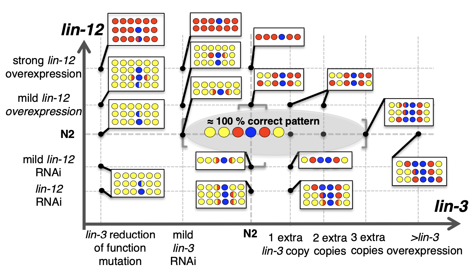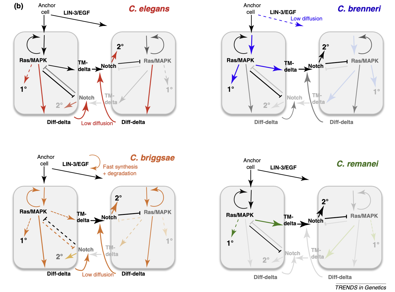 A major finding concerns the evolution of signaling pathways specifying the vulval cells: while the final pattern of central cell fates is invariant, the team showed that the developmental route leading to it evolves between species and varies within a species depending on genetic background and environment - a key example of what has been called "developmental system drift". Different species of Caenorhabditis are located in the parameter space of a quantitative model of the signaling network.