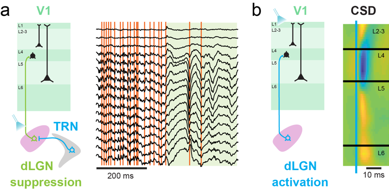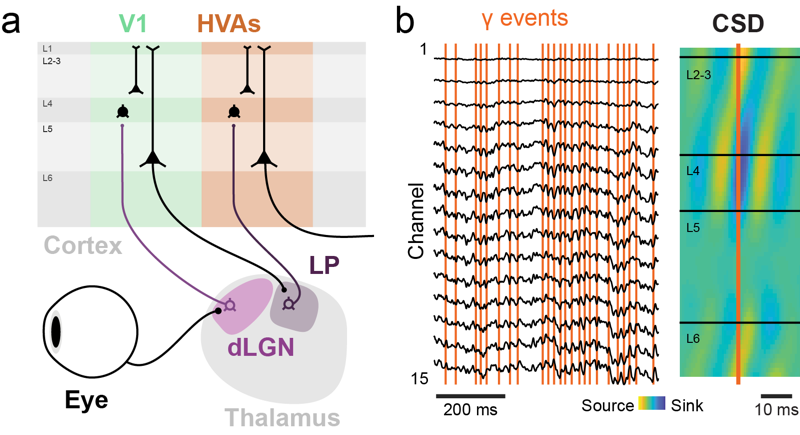 A key idea of the work of Quentin Perrenoud is to approach gamma oscillation as specific neural events which, if singled out, can give us a lens into cortical computations. Taking advantage of modern multi-channel electrode arrays, Quentin developed a new method allowing to detect gamma waves with millisecond precision (https://github.com/cardin-higley-lab/CBASS?tab=readme-ov-file). Applying this method in the visual cortex revealed that gamma waves correspond to brief events of cascading thalamocortical synchrony lasting 15ms. Gamma events start in the thalamus and progress quickly through cortical layers bearing the mark of a feedforward pass of through the thalamocortical hierarchy (Fig. 1b). With optogenetics, a technique permitting to modulate neural activity with light, he either suppressed or evoked Gamma events artificially through briefs activation of the thalamus (Fig. 2). Strikingly, the suppression of gamma events impaired visual perception while artificial gamma events created illusory visual percepts. Finally, he showed that the rate of gamma events varies flexibly as a function of behavior and increase notably during visually informed decisions.